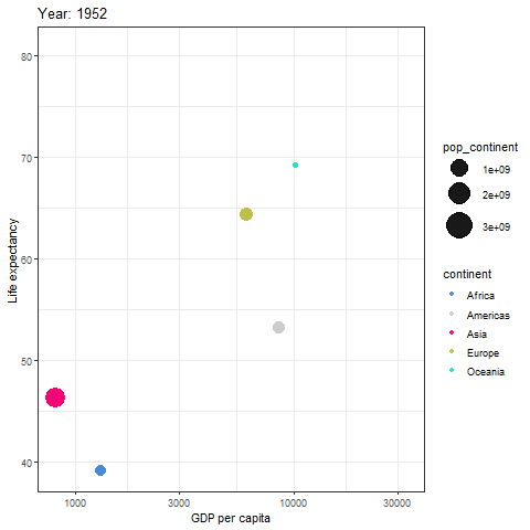 In addition to the popular visualization library “ggplot2”, we will also use the package “gganimate” to make our figure more dynamic. Since we aim to see the evolution by continent, we need to create some new variables. Lastly, remember that we used “size” in aesthetics to add information about the population. That is why we can see three different variables represented over time.