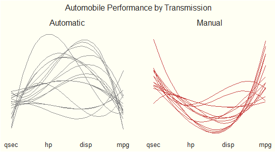 Our goal is to find unknown patterns that help distinguish between Automatic and Manual Transmission cars by its performance. We created two Parallel Coordinate figures with the following variables: