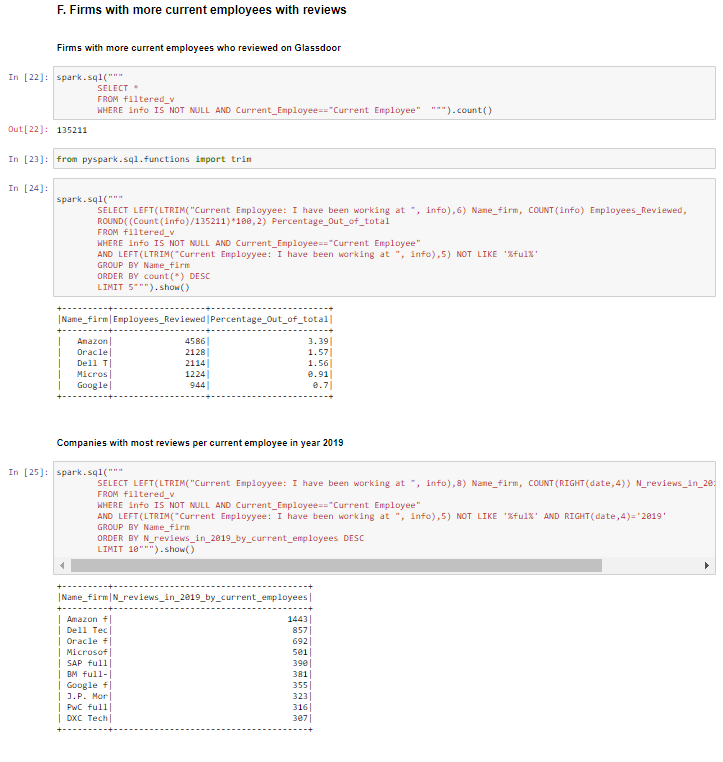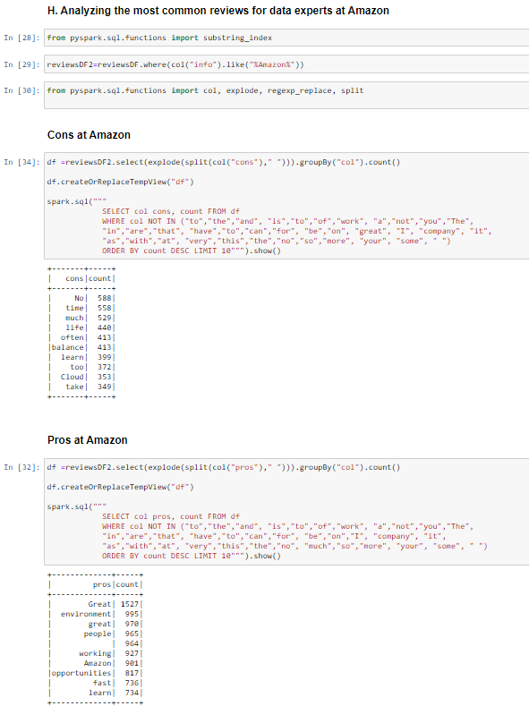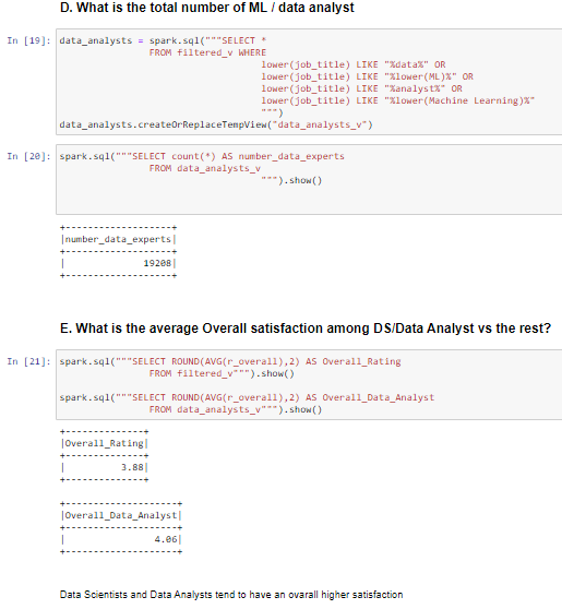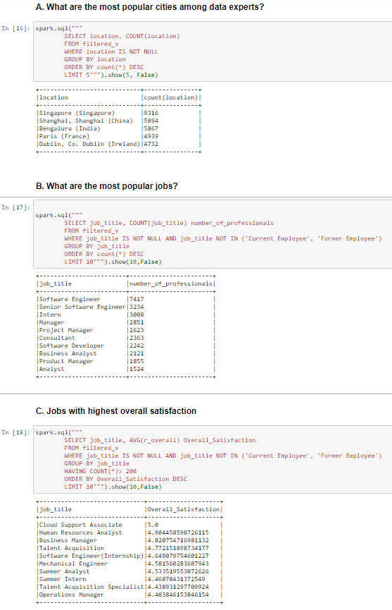 From [Cell 16 to 21] we use the SQL API to do the queries that will answer our questions about the characteristics of the most relevant job titles.