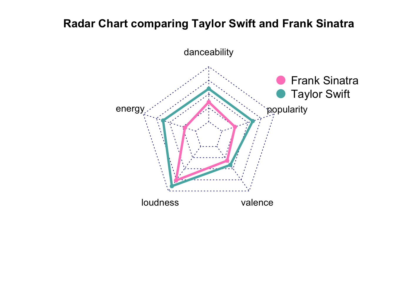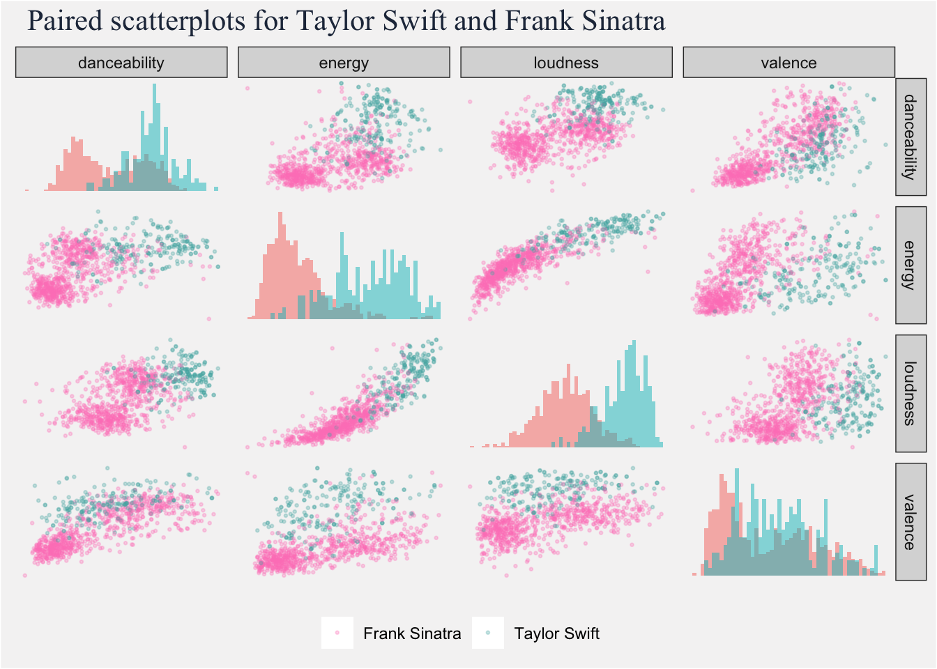 Finally, we compared the artist with the highest popularity before the 200’s, Frank Sinatra, with Taylor Swift, the most popular artist after the 2000’s.